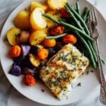 Herb-Crusted Tilapia with Roasted Vegetables is a wholesome and flavorful sheet pan dinner featuring tender tilapia fillets coated with a savory herb and Parmesan breadcrumb crust, accompanied by a vibrant medley of roasted broccoli, bell pepper, zucchini, and red onion. This easy-to-make baked dish is perfect for a healthy weeknight meal or a casual dinner gathering.