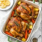 This roasted Cornish hen recipe features tender, flavorful birds seasoned with herbs and lemon zest, perfectly roasted alongside hearty potatoes, carrots, and onions. Ideal for a comforting weeknight dinner, the hens are brushed with a savory olive oil mixture, roasted to juicy perfection, and served with pan-roasted vegetables that soak up the delicious drippings.