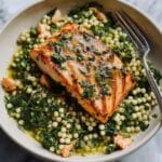 - Assemble and Serve: Serve the seared salmon fillets on a bed of the herbed pearl couscous. Garnish with extra fresh herbs, lemon wedges, and optional toppings such as sautéed baby spinach, cherry tomatoes, or crumbled feta cheese for additional freshness and texture.