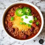 - Serve: Serve the hot chili in bowls topped with optional garnishes such as Greek yogurt, shredded cheddar cheese, chopped green onions, or fresh cilantro for added creaminess and freshness.