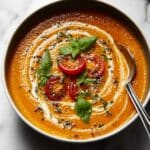 This Homemade Roasted Tomato Soup is a rich, creamy, and comforting bowl of goodness made from fresh roasted tomatoes, sautéed onions, garlic, and vegetable broth, finished with a touch of heavy cream and fresh basil. Perfect for a cozy meal, this soup balances the natural sweetness of roasted tomatoes with savory aromatics for a satisfying and flavorful experience.