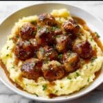 - Serve: Spoon the warm mashed potatoes onto plates and top generously with the Salisbury meatballs and their rich gravy. Serve hot for a comforting and satisfying meal.