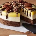 - Assemble the Cheesecake: Once the cheesecake has fully chilled, drizzle the caramel sauce evenly over the top. Next, add the chocolate sauce in a decorative swirl pattern on top of the caramel. Garnish by sprinkling additional toasted pecans over the surface.