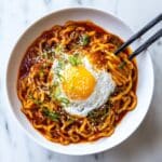 This Kimchi Udon with Scallions recipe is a vibrant and comforting Korean-inspired dish featuring chewy udon noodles tossed in a savory, spicy sauce made with kimchi, gochujang, and aromatic seasonings. Quick and easy to prepare on the stovetop, this vegetarian main course is perfect for a flavorful weeknight meal.