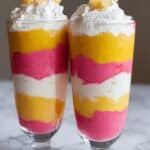 A refreshing and visually appealing layered sundae featuring smooth mango and raspberry ice creams, topped with whipped cream, fresh raspberries, and a drizzle of honey or fruit syrup. Perfect for a quick and delicious dessert that combines fruity flavors with creamy textures.