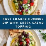 This Loaded Hummus Dip is a vibrant and flavorful Mediterranean-inspired appetizer featuring creamy roasted garlic hummus topped with a colorful Greek salad mix of feta cheese, cucumbers, cherry tomatoes, kalamata and green olives, red onions, and fresh herbs. It’s perfect for serving with warm pita bread or pita chips, making it a crowd-pleasing dish for gatherings or casual snacking.