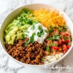 A flavorful and healthy low-carb burrito bowl featuring seasoned ground chicken or beef, sautéed cauliflower rice, fresh vegetables, and creamy toppings. Perfect for a quick, nutritious meal that fits well into a low-carb lifestyle.