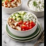 This Mediterranean Chicken Bowl is a healthy and flavorful meal combining tender lemon-garlic chicken breast with a refreshing cucumber-dill yogurt sauce, served over fluffy rice or quinoa and fresh diced vegetables for a vibrant, nutritious dish perfect for lunch or dinner.