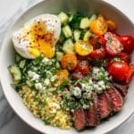 A quick and flavorful Mediterranean Steak Bowl featuring perfectly seared steak, fresh cucumber, tomato, and red onion, complemented by creamy hummus and tangy tzatziki. This wholesome dish is easy to prepare in just 20 minutes and perfect for a nutritious lunch or dinner.