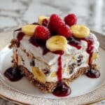 This no-bake banana split cake layers a graham cracker crust with creamy sweetened cream cheese, fresh bananas, pineapple, strawberries, and whipped topping, finished with nuts, chocolate syrup, and maraschino cherries. A refreshing and easy-to-make dessert perfect for warm weather or any occasion.