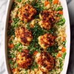 - Prepare the chicken: Season the chicken breasts evenly with kosher salt and freshly ground black pepper. Nestle the chicken breasts gently into the rice mixture in the baking dish.