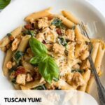 7. Garnish and Serve: Serve the pasta garnished with torn fresh basil and additional Parmesan cheese as desired. Enjoy your delicious, creamy Tuscan chicken pasta!