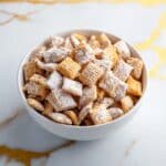 - Cool & Set: Spread the coated puppy chow onto a parchment-lined baking sheet to cool completely and allow the coating to set properly.