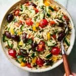 A refreshing and easy Orzo Pasta Salad featuring tender orzo pasta tossed with fresh cherry tomatoes, crisp cucumber, red onions, black olives, and crumbled feta cheese, all dressed in a tangy red wine vinaigrette and garnished with fresh basil. Perfect as a light lunch or a vibrant side dish ready in just 20 minutes.