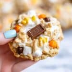 - Add Toppings and Continue Baking: Remove the baking sheet from the oven and immediately top each cookie with mini marshmallows, a piece of Hershey bar, Reeses Pieces, and mini chocolate chips. Return the baking sheet to the oven and bake for an additional 6 to 7 minutes, until the marshmallows are toasted and chocolate is melted.