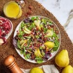 A refreshing and vibrant Pear Pomegranate Salad featuring mixed baby greens, thinly sliced ripe pears, juicy pomegranate arils, glazed pecans, and crumbly feta cheese, all brought together with a sweet and tangy Maple Dijon Vinaigrette. Perfect for a light lunch or as a colorful side dish.