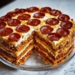 This Pepperoni Pizza Layer Cake is a fun and impressive twist on classic pizza, featuring multiple layers of crispy pizza crusts stacked with rich pizza sauce, gooey mozzarella and Parmesan cheeses, and savory pepperoni slices. Baked to golden perfection, it’s perfect for parties or family dinners when you want a delicious and visually striking main course.