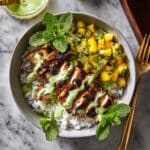 - Serve: Serve the roasted chicken over bowls of cooked rice and top with generous spoonfuls of the creamy green sauce. Garnish with extra mango and avocado chunks if desired. Enjoy this vibrant and flavorful Peruvian-inspired meal!