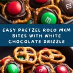 Finally, melt your white chocolate chips in short bursts in the microwave, stirring in between to make it smooth and silky. Use a spoon or piping bag to drizzle the white chocolate over your chilled Pretzel Rolo M&M Bites Recipe for an elegant finish. Let the drizzle set at room temperature or pop them back in the fridge for about 5 to 10 minutes before diving in.