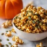 This Pumpkin Spice Caramel Popcorn recipe combines the warm, cozy flavors of pumpkin spice with sweet, buttery caramel coating for a delightful autumn-inspired snack. Topped with roasted pumpkin seeds for an added crunch and nutty flavor, it’s perfect for sharing during fall gatherings or enjoying as a festive treat.