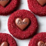 These Red Velvet Chocolate Blossom Cookies are a festive and delicious treat featuring soft, cocoa-infused red velvet dough rolled in red sugar and topped with a melted Dove Chocolate Heart. Perfect for holidays or special occasions, these cookies have a beautiful appearance with a rich, creamy chocolate center that melts slightly when pressed into the warm cookies right after baking.