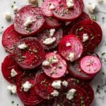 - Add Goat Cheese and Herbs: Transfer the roasted beets and radishes to a serving dish. Sprinkle the crumbled goat cheese evenly on top, and garnish with chopped fresh parsley or chives for added color and flavor.