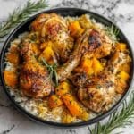 A hearty and comforting roasted chicken bake featuring tender boneless skinless chicken thighs, sweet butternut squash, and delicate leeks, all baked together with savory herbs, garlic, and parmesan cheese for a flavorful and satisfying meal.