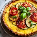 - Cool and Serve: Let the quiche cool for 10 to 15 minutes at room temperature before slicing. Garnish with fresh basil leaves if desired, then serve warm, room temperature, or chilled.