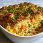 This Delicious Rotisserie Chicken Stuffing Casserole is a comforting and hearty dish perfect for using up store-bought rotisserie chicken. It combines classic herb stuffing mix with sautéed vegetables, shredded rotisserie chicken, and melted cheddar cheese. Baked to golden perfection, this casserole offers a creamy, savory meal ideal for family dinners or holiday gatherings.