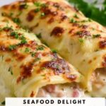 Lay out the cooked lasagna noodles flat on a clean surface. Spread a generous amount of the seafood filling evenly over each noodle. Carefully roll each noodle tightly, making sure the filling stays inside. Arrange the roll-ups seam-side down in your prepared baking dish for the best presentation and to keep them intact during baking.