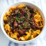 This Slow Cooker Korean Beef Noodles recipe is a comforting and flavorful dish combining tender braised beef with spicy gochujang and savory soy flavors, slow-cooked to perfection and served over quick-cooking udon noodles. Ideal for a hands-off meal, it offers rich, melt-in-your-mouth beef infused with the complex tastes of Korean-inspired seasonings and garnished with fresh coriander and nutty black sesame seeds.