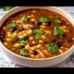 This Southwest Black Bean Chicken Tortilla Soup is a hearty and flavorful dish perfect for a comforting meal. It features tender rotisserie chicken, black beans, sweet corn, fire-roasted tomatoes, and a blend of Southwest spices simmered in a savory chicken broth, topped with crispy homemade tortilla chips for an extra crunch. Ideal for family dinners or meal prep, this soup delivers layers of smoky, spicy, and tangy flavors in every bowl.