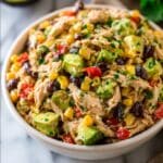 A creamy and zesty Southwest Chicken Salad packed with protein and fresh flavors, perfect for a quick, healthy meal. This no-cook salad combines shredded chicken, fresh vegetables, and a tangy yogurt-lime dressing seasoned with chili powder and cumin.