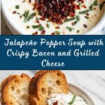 Spicy Jalapeño Popper Soup is a rich, creamy, and fiery blend of jalapeños, cream cheese, crispy bacon, and sharp cheddar cheese, capturing the bold flavors of the classic appetizer in a comforting soup. Served alongside crunchy grilled cheese dippers made with buttery toasted sourdough and melted cheddar, this dish offers the perfect combination of spicy, cheesy, and smoky tastes for a cozy and crave-worthy meal.