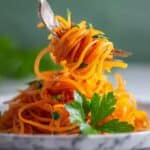 Spicy Korean Carrots is a vibrant and flavorful salad featuring julienned carrots marinated in a tangy and spicy blend of vinegar, smoked paprika, garlic, and coriander, finished with infused hot oil for a rich depth of flavor. This easy-to-make side dish is perfect for adding a kick and refreshing crunch to any meal.