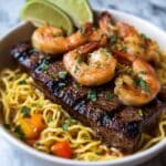 A delightful recipe combining tender steak, succulent shrimp, and flavorful noodles tossed with vibrant mixed vegetables and a savory sauce. This quick and easy stir-fry dish offers a perfect balance of protein and veggies in just 35 minutes, making it an ideal dinner for any night of the week.