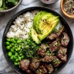 A flavorful and nutritious Steak Avocado Rice Bowl featuring marinated flank steak, jasmine rice, fresh avocado, cherry tomatoes, corn, black beans, and a hint of lime juice. This satisfying meal combines smoky spices with fresh ingredients for a balanced and delicious bowl perfect for lunch or dinner.
