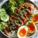 Delicious and easy-to-make Sticky Chicken Rice Bowls featuring tender chicken thighs coated in a sweet and savory sauce, served over fluffy jasmine or brown rice, and topped with fresh vegetables and sesame seeds for added texture and flavor. Perfect for a quick weeknight dinner that satisfies the whole family.