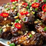 Deliciously sticky and flavorful lemongrass chili chicken wings cooked to perfection in an air fryer. These wings are marinated in a vibrant blend of soy sauce, brown sugar, fresh ginger, garlic, and lemongrass, then air fried until caramelized and crispy. Topped with crunchy toasted peanuts, fresh chili, and spring onions, this recipe delivers a perfect balance of sweet, spicy, and tangy flavors in a healthy, quick cooking method.
