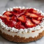 A delightful no-bake Strawberry Crunch Cheesecake featuring a crunchy graham cracker crust layered with a creamy mixture of cream cheese, powdered sugar, Cool Whip, and fresh strawberries. Perfectly chilled to set and serve as a refreshing dessert.