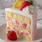 This Strawberry Lemonade Cake Layers recipe features moist, flavorful cake layers infused with strawberry puree and strawberry extract, baked to perfection and paired with a tangy lemon frosting. The cake is enhanced with layers of fresh strawberries and finished with lemon syrup and a decorative garnish of lemon wedges and strawberries, perfect for a refreshing and vibrant dessert.