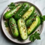 Sumac Cucumbers are a refreshing and zesty Middle Eastern side dish featuring thinly sliced cucumbers tossed with extra virgin olive oil, fresh lemon juice, and tangy ground sumac. This simple, no-cook salad is light, vibrant, and perfect to accompany grilled meats, roasted vegetables, or Mediterranean meals. Garnished with fresh parsley or dill, it offers a delightful combination of crisp textures and bold flavors that come together in just 10 minutes.