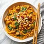 - Combine and serve: Add the drained noodles to the thickened sauce and stir well to coat evenly. Divide the noodles into serving bowls, then garnish with fresh basil ribbons, chopped roasted cashews or peanuts, and a sprinkle of extra red pepper flakes for added heat if desired. Serve immediately for best flavor and texture.