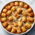 This Tater Tot Chicken Pot Pie is a comforting and delicious twist on the classic chicken pot pie, featuring a creamy chicken and vegetable filling topped with crispy, golden tater tots. Perfect for a hearty family dinner, this recipe combines tender rotisserie chicken, fresh vegetables, and a rich, flavorful sauce baked to perfection under a crispy tater tot crust.