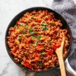 A hearty and flavorful one-pan meal featuring ground beef or turkey, bell peppers, rice, and tomatoes, cooked together in a skillet for a comforting and easy dinner option.