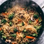 - Garnish and Serve: Remove the stir-fry from heat. Garnish with sliced green onions and a sprinkle of sesame seeds. Serve immediately while hot and enjoy your flavorful vegan lo mein!