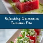 Bring your beautifully assembled Watermelon Cucumber Feta Cups Recipe out to the table just before your guests arrive. The cool, succulent bites will wow at any party or make a simple snack feel extra special.